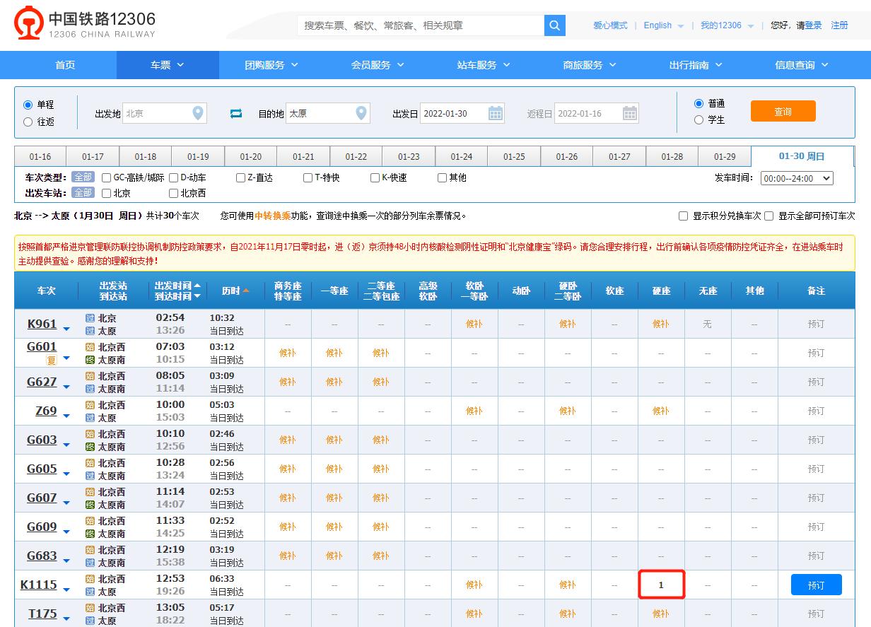 1月16日,中新经纬查询12306网站发现,2022年除夕前一日(1月30日),部分车站的火车票已经很紧俏。以1月30日从北京出发为例,截至1月16日16时,热门车站如长春、沈阳、石家庄、太原等的余票所剩无几。