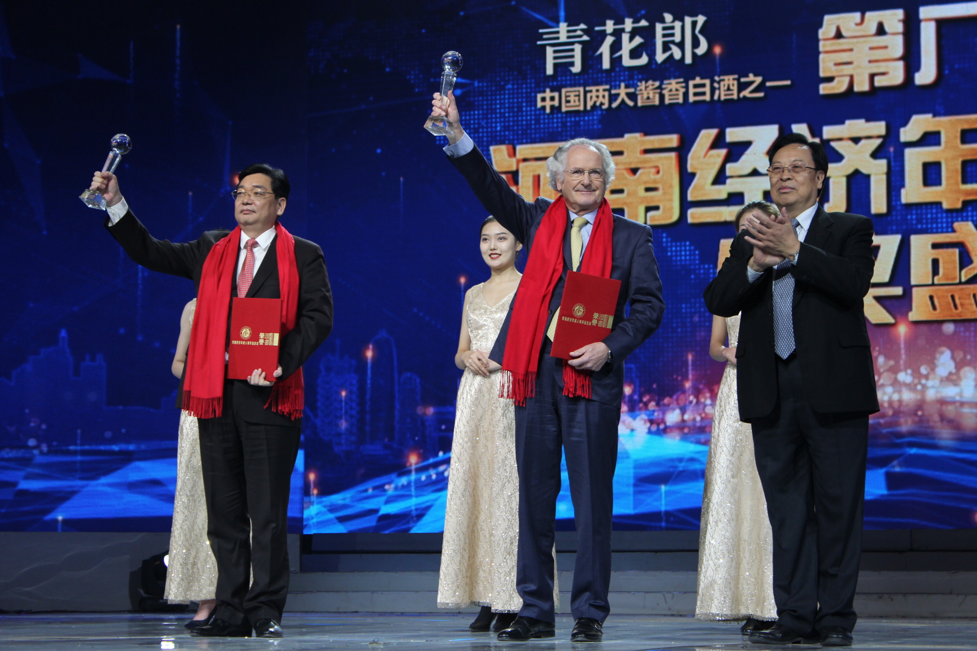 河南民航发展投资有限公司党委书记、董事长张明超(左)和卢森堡国际货运航空公司董事长Paul Helminger(右)代表郑州——卢森堡"空中丝绸之路"建设运营团队上台领奖