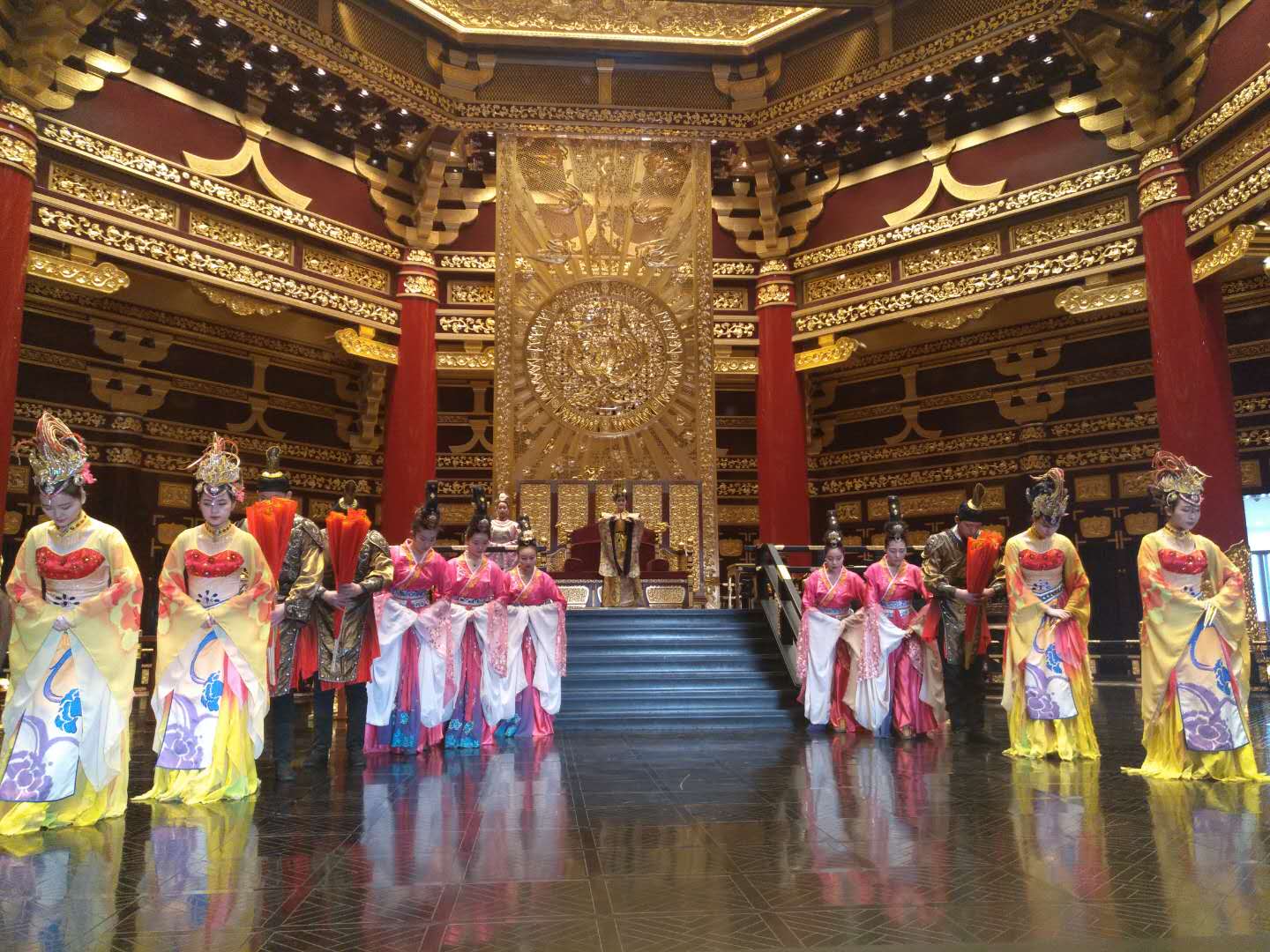 明堂景区的古装实景演出,以真人、实景、原貌再现为演艺手法以情景剧和汉唐舞蹈为主要表现形式,视觉化地呈现景区历史文化资源。演出突出女皇称帝洛阳、指点江山的不凡气度及盛唐时期气势恢宏的盛世景象。