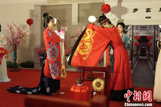 中新网上海3月3日电 (王笈)“名门佳媛,望族公子,天作之合,永结秦晋。”一场雍容华贵的大唐婚典3日在上海市群众艺术馆元宵主题市集上演,掀起了一股“观礼大潮”。虽整场婚礼不足半小时,馆内一楼至二楼早已围满观众,分外热闹。