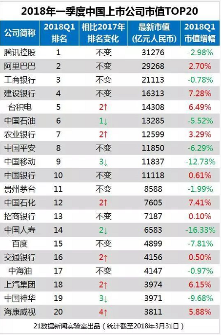 此榜单是21数据新闻实验室在全球15个交易所上市的6781家中国公司,对其2018年一季度末市值进行加总换汇计算得出。