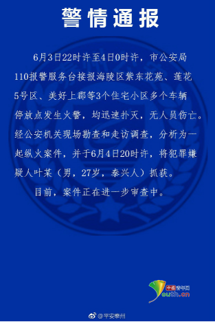 6月4日22点57分,泰州市公安局官方微博发布警情通报表示,6月3日22时许至4时0时许,市公安局110报警服务台接报海陵区紫东花苑、莲花5号区、美好上郡等3个住宅小区多个车辆停放点发生火警,均迅速扑灭,无人员伤亡。经公安机关现场勘查和走访调查,分析为一起纵火案件,并于6月4日20时许,将犯罪嫌疑人叶某(男,27岁,泰兴人)抓获。