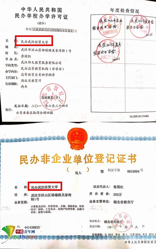 鲁国红提供的原民办武汉经贸大学办学许可和相关证书。