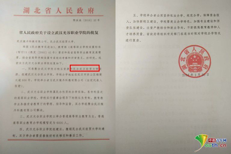7日下午,湖北省教育厅相关工作人员告诉中国青年网记者,民办武汉经贸大学是一个从事高等教育自学考试助学辅导的非学历机构,2016年3月经湖北省政府批准,在原校基础上组建武汉光谷职业学院,民办武汉经贸大学的建制随之被撤销,官方网站也不再使用。