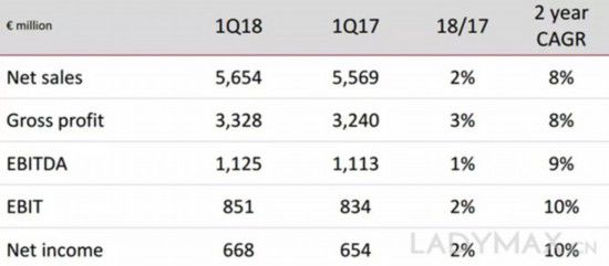 在截止1月31日的 2017 财年内,Inditex 集团销售额增长9%至 253.4 亿欧元,告别两位数的增长,较上一财年12%的增幅进一步放缓,折旧摊销前利润同比上涨 12% 至 43 亿欧元,净利润同比增长7%至33.7亿欧元。