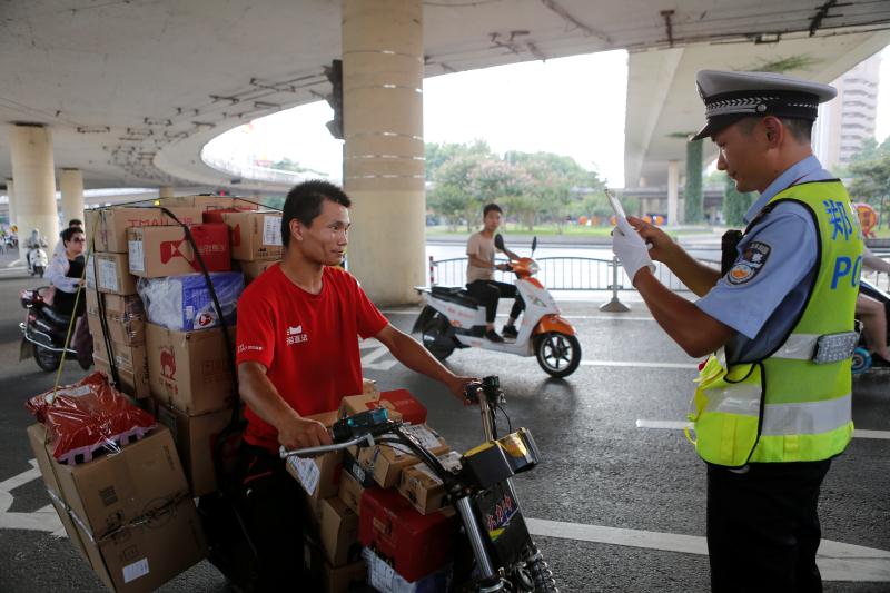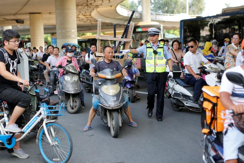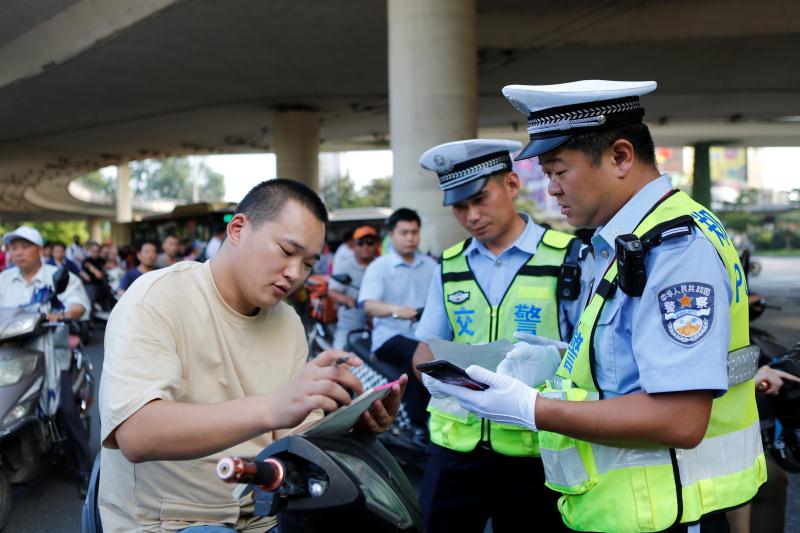 17时许,整治行动正式打响,17:05分,在省人民会堂门前,两名骑电动车的男子因为携带超高超长的物体,被执勤交警拦下处罚。