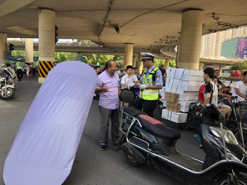 17:10分,在紫荆山立交桥东口桥下,一名骑电动车的男子,因电动车安装了超宽的遮阳伞,存在刮蹭其他车辆和行人的危险,被执勤交警拦下,责令其当场拆下遮阳伞。