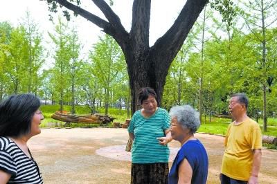 赵连芳(左二)和邻居们站在一株树龄近百年的“加杨”旁回忆儿时这里的情景:“我记得有棵枣树结的枣这么大。”她希望建好的公园今后一定要管好。