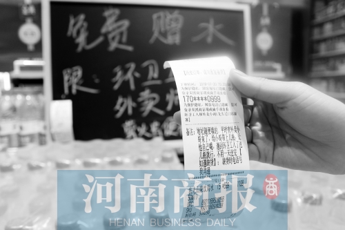 几天前,在郑州市博颂路与信息学院路交叉口的一便利店内,摆着一块小黑板,上面贴着一张外卖订单,黑板上写着“免费赠水”,赠水对象只限环卫工人和外卖小哥,黑板前堆了599瓶矿泉水。