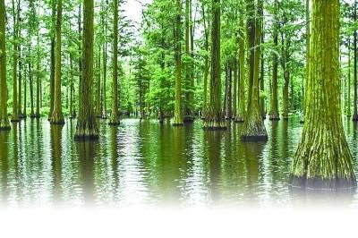 涨渡湖中,约800株池杉“破水而出”。水中有树,树上有鸟,湖中有鱼,是涨渡湖种植池杉区域特有的迷人风景,“水上森林”是人们给予这片区域的美称。