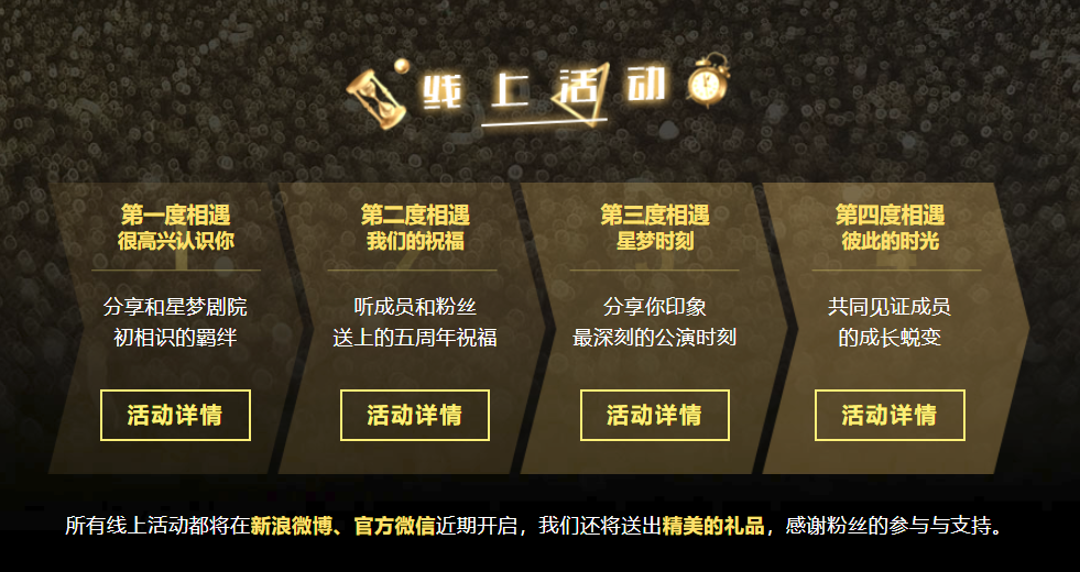 五年间,SNH48星梦剧院每次都离不开粉丝的支持与陪伴,为了纪念这份美好,此次还特别推出了线上四大收集活动,不仅收获了大量粉丝祝福,同时SNH48也感恩回馈粉丝一直以来的不离不弃的,充分把线下握手会的火爆传递到了线上。