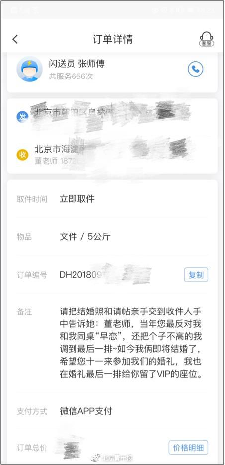 一张结婚照、一封婚礼请帖、一个闪送订单,简单的三张图一段文字,信息量却一点都不少呀。