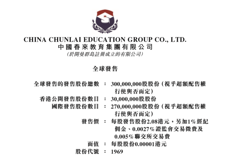 9月12日,春来教育发布《配发结果公告》。公告显示,春来教育共发行3亿股,发行价每股2.08港元,每手1000股,预期9月13日上市。其中,香港公开发售项下分配的发售股份最终数目为3000万股,相当于发售股份总数的10%;国际发售项下分配予承配人的发售股份最终数目为2.74亿股,相当于任何超额配售权获行使前发售股份总数的91.4%。