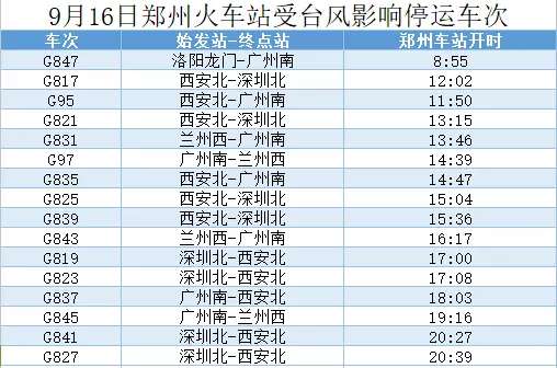 大河网讯(记者 祝传鹏)9月16日,大河网记者从郑州火车站获悉,受台风“山竹”影响,郑州火车站早上8点接到调度命令,截至目前,9月16日停运列车为:G841、G839、G97、G831、G827、G817、G847、G821、G825、G819、G95、G823、G835、G837、G843、G845次列车停运。