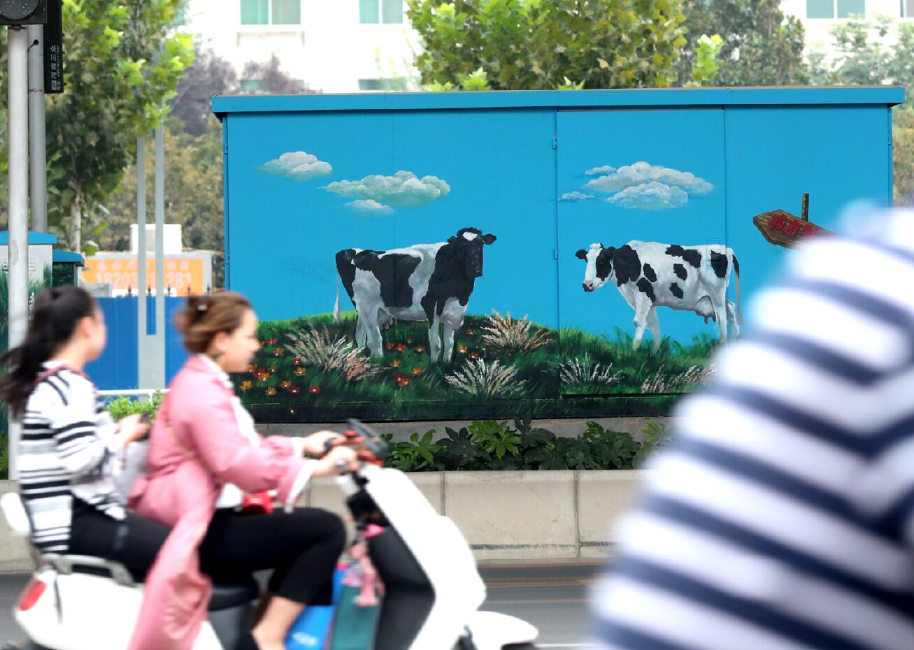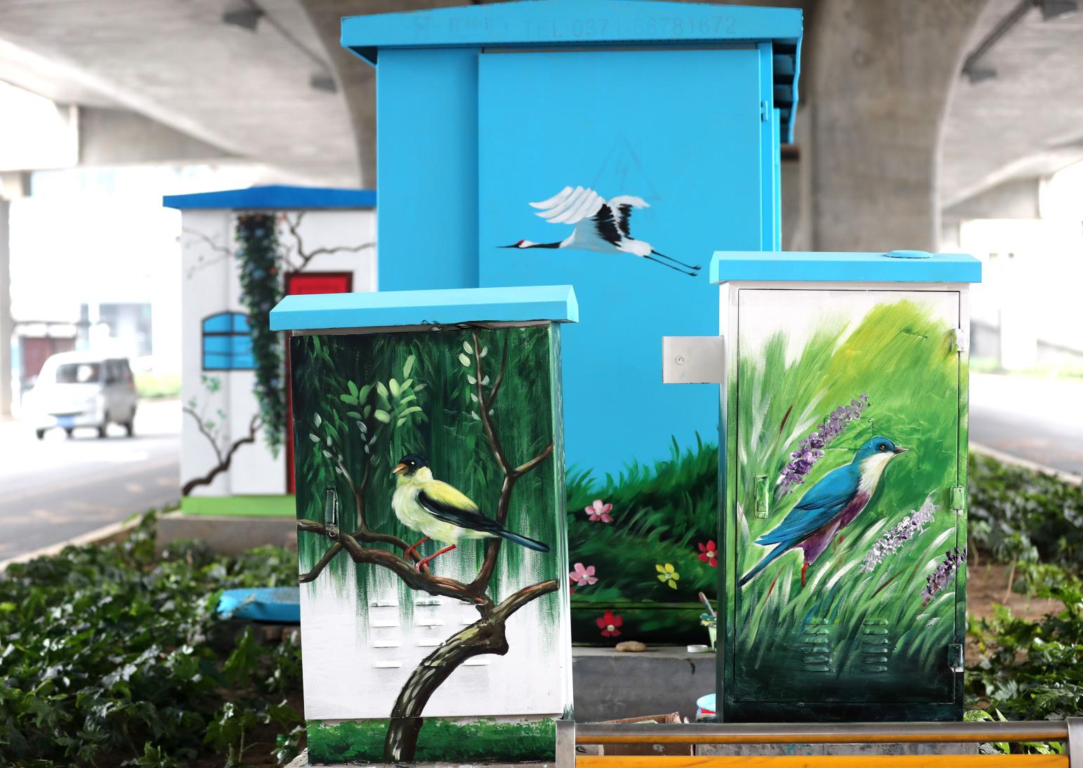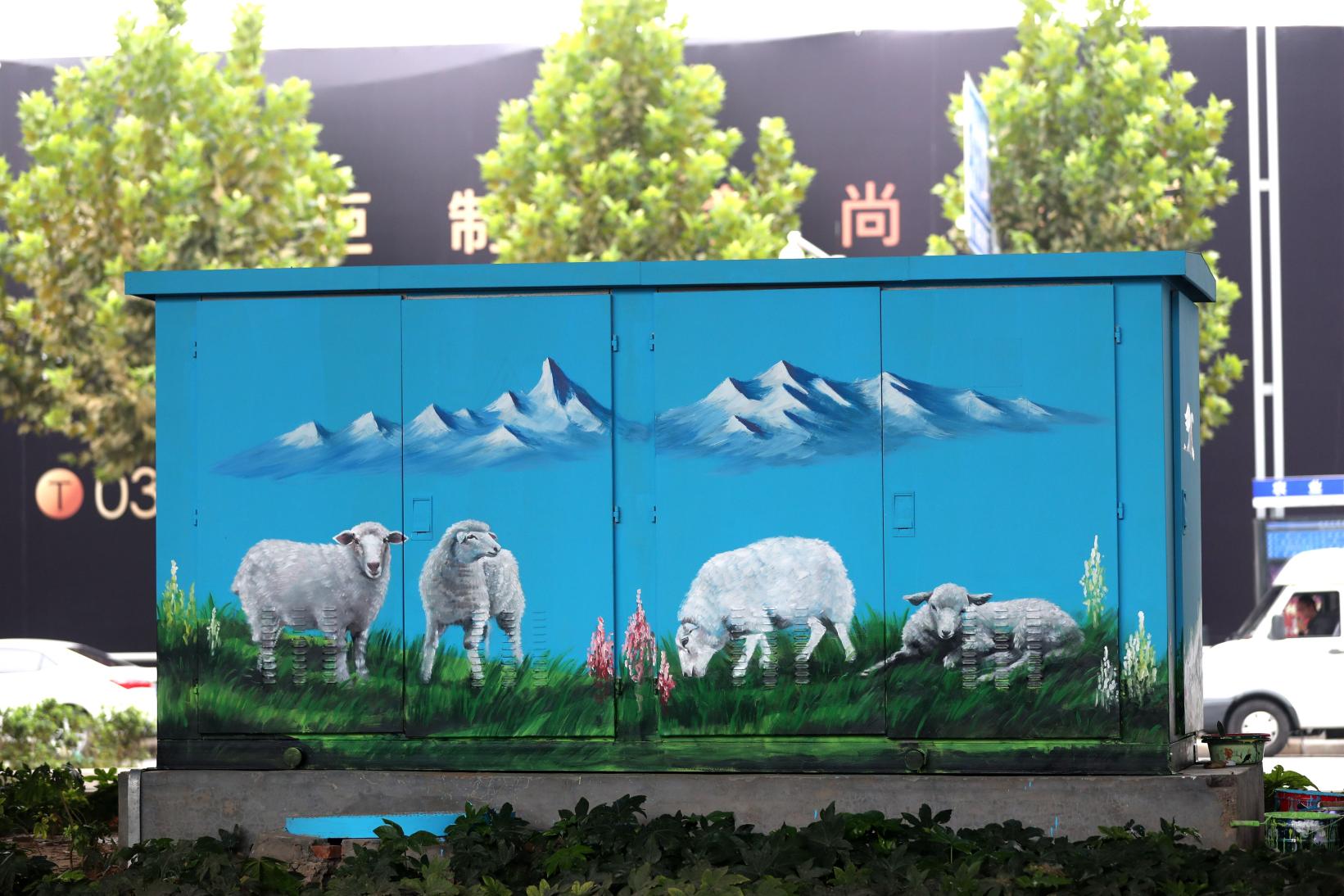 这些变了脸的配电箱,主要分布在农业路(中州大道-经二路)沿线的绿化带和路口处。本来是灰白色的配电箱,也被赋予了不一样的主题和色彩。有“雪山皑皑远,青草白羊肥”,有“丛林红似燃,呦呦鹿在鸣”,有白鸟飞天、黄鸟在枝、蓝鸟在花丛,有远近高低的松树,有红黄相间的秋树,也有木板拼成的房子,有卡通风格的建筑。