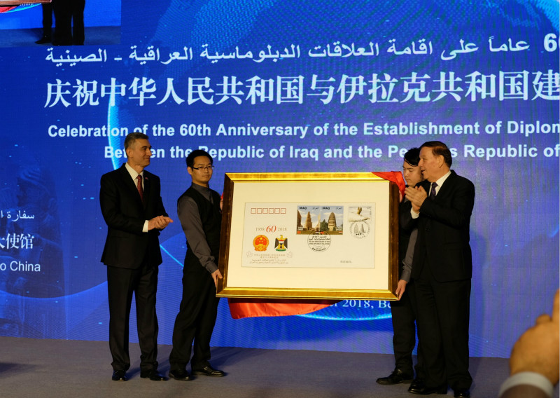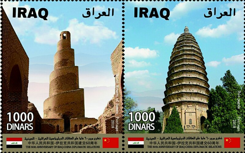 9月18日,记者从中国邮政集团公司河南省分公司获悉,近日在北京举行的中国-伊拉克建交60周年招待会上,全国人大常委会副委员长艾力更·依明巴海、伊拉克驻华大使艾哈迈德·贝尔瓦利共同为伊拉克邮政发行的《中伊建交60周年》纪念邮票和外交封揭幕。在纪念邮票上,嵩岳寺塔和伊拉克巴别塔分别代表了中伊两国的历史文化形象。双塔辉映,象征着中伊友好交往源远流长。