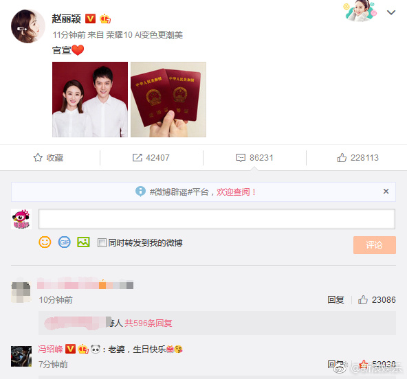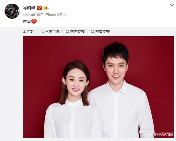 10月16日,赵丽颖冯绍峰同时在微博晒出结婚照宣布二人结婚。