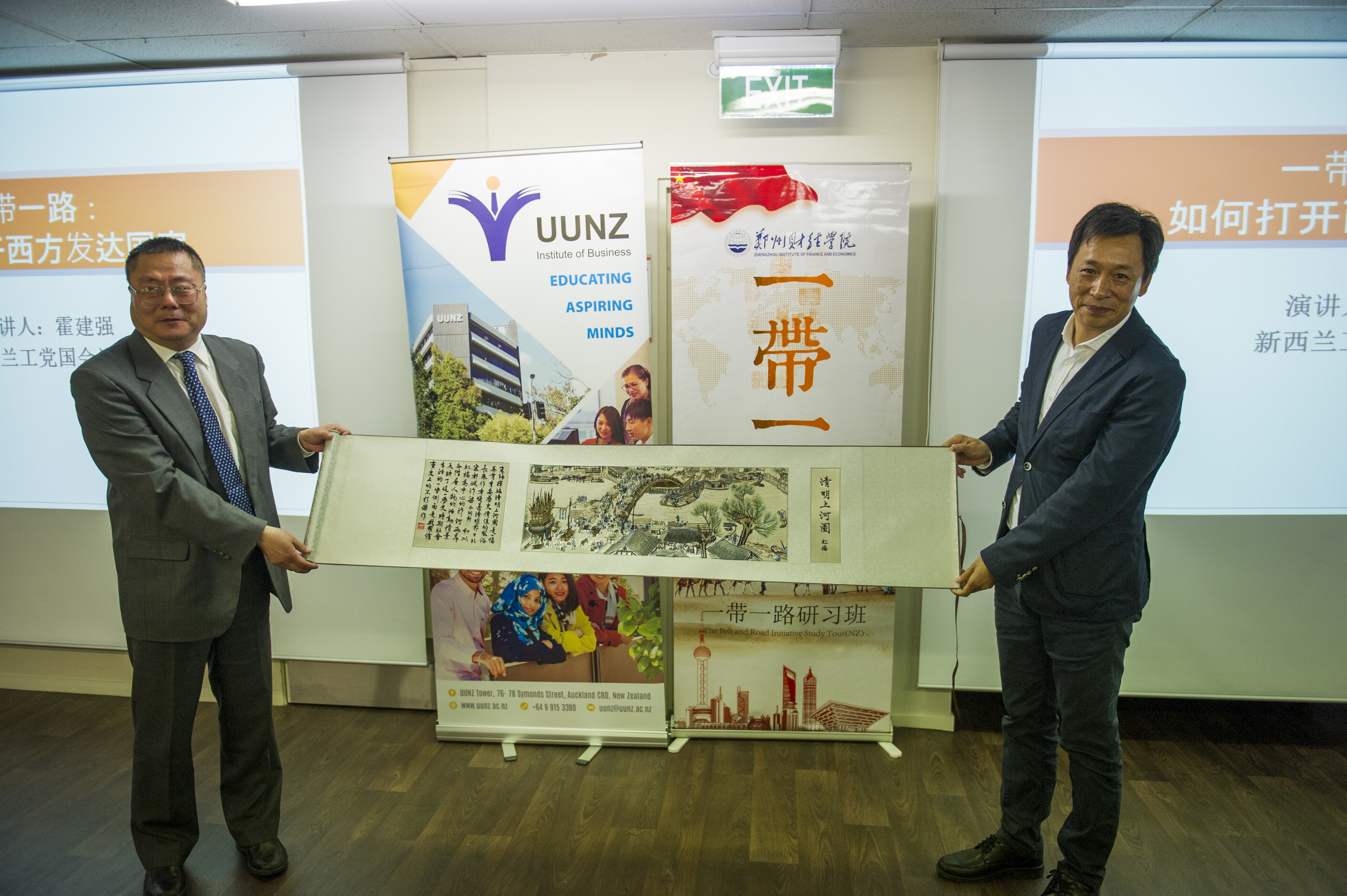 郑州财经学院理事长牛钦民在该校“一带一路”新西兰研习班上向大使馆赠礼