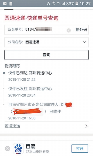 12月4日上午,王先生向大河报·大河客户端记者讲述了事情的经过。因老家亲属近期办事需要用到自己的户口本,在郑州市金水东路51号写字楼上班的王先生便在11月28日下午4点左右叫来了圆通公司的快递小哥,把夹有500元现金的户口本包好装进了快递文件袋。“在我们老家新乡市长垣县,圆通公司的快递点比较多,所以一直以来我都是选择的圆通快递。”王先生说,“在填写完快递单据并交付了10元的快递费后,我把快递单号输在了手机里,以便能够及时查询快递动向。”