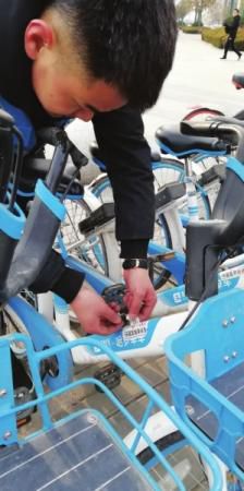 王永军有一个“万能”背包,在他的背包里装有修车的扳手、偏口钳、拉铆枪、抹布、故障贴、备用的车梯子和二维码。对于一般的“小毛病”,他几分钟就可以搞定,受损比较严重的单车,就要贴上故障贴,等待专人收回。一瓶纯净水、一块抹布,小王碰到积灰的、倒地的单车,他就会上前擦擦灰、摆整齐。