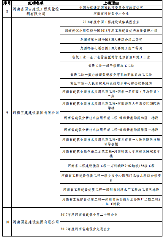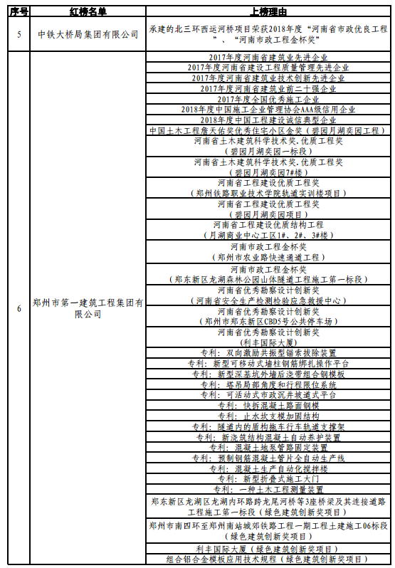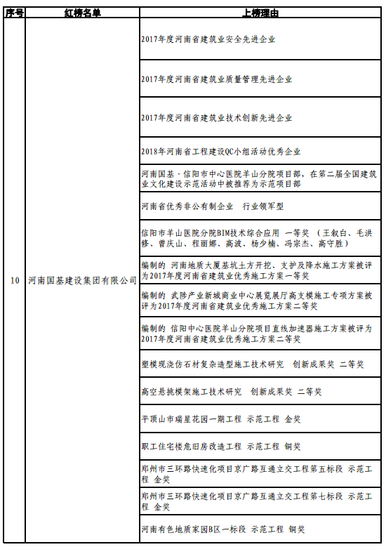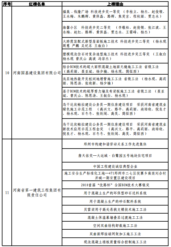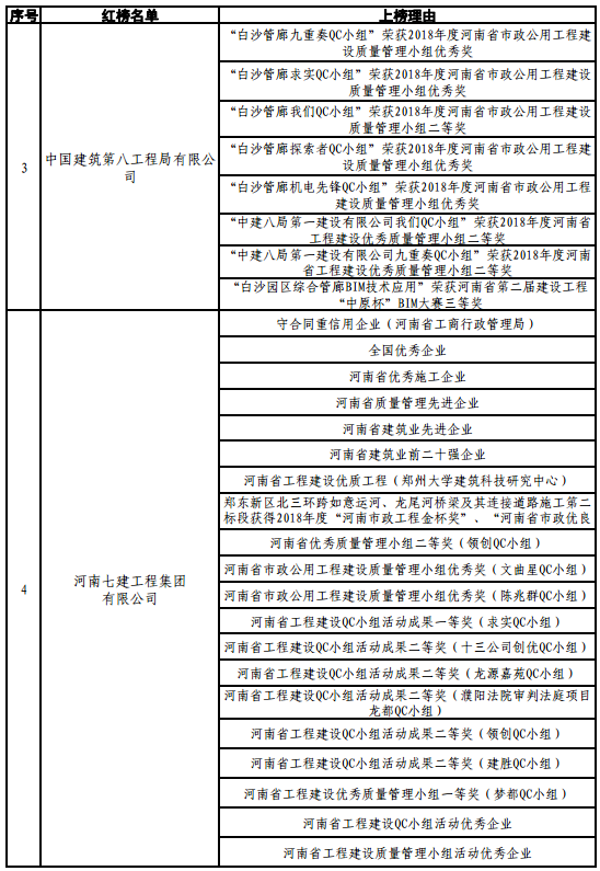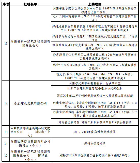 在此次公布的“红黑榜”名单上,登上红榜的有12家企业,包括河南省第一建筑工程集团有限责任公司、恒兴建设集团、河南七建工程集团、河南国基建设集团、泰宏建设发展有限公司等。