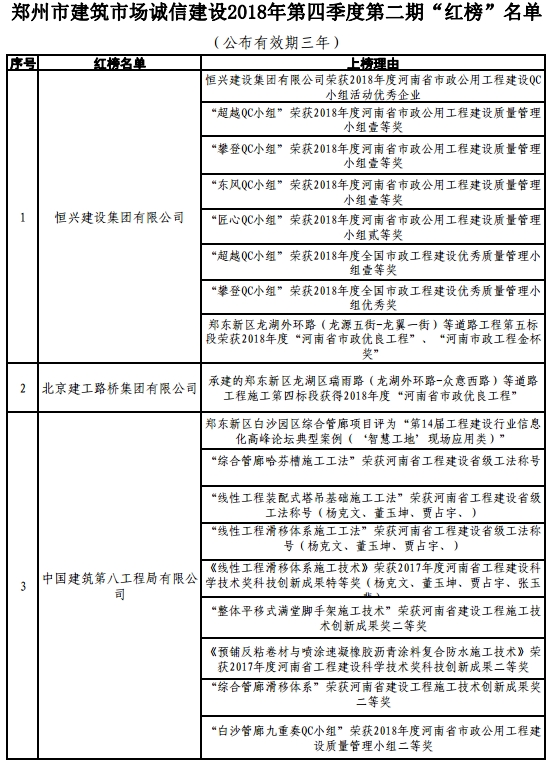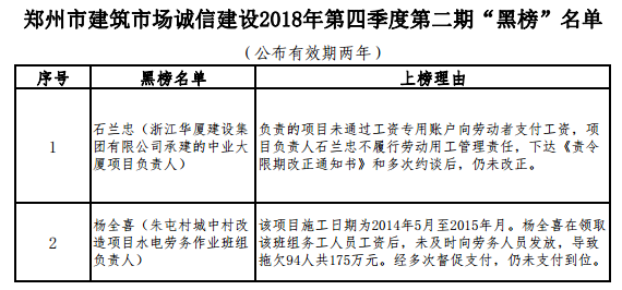 1月2日,郑州市城乡建设委员会发布郑州市建筑市场诚信建设2018年第四季度第二期“红黑榜”名单。