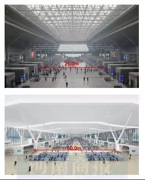 这个距离,郑州东站是约25米,郑州南站是大于60米,候车通道宽度加大,减少了相互干扰。