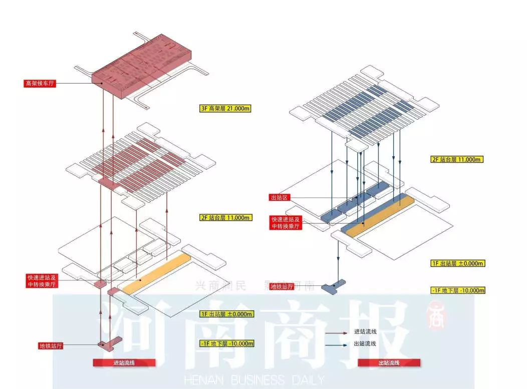 而郑州南站除了上述传统的上部进站模式之外(从三层候车厅检票乘车),还在出站层(一层)设置快速进站厅。