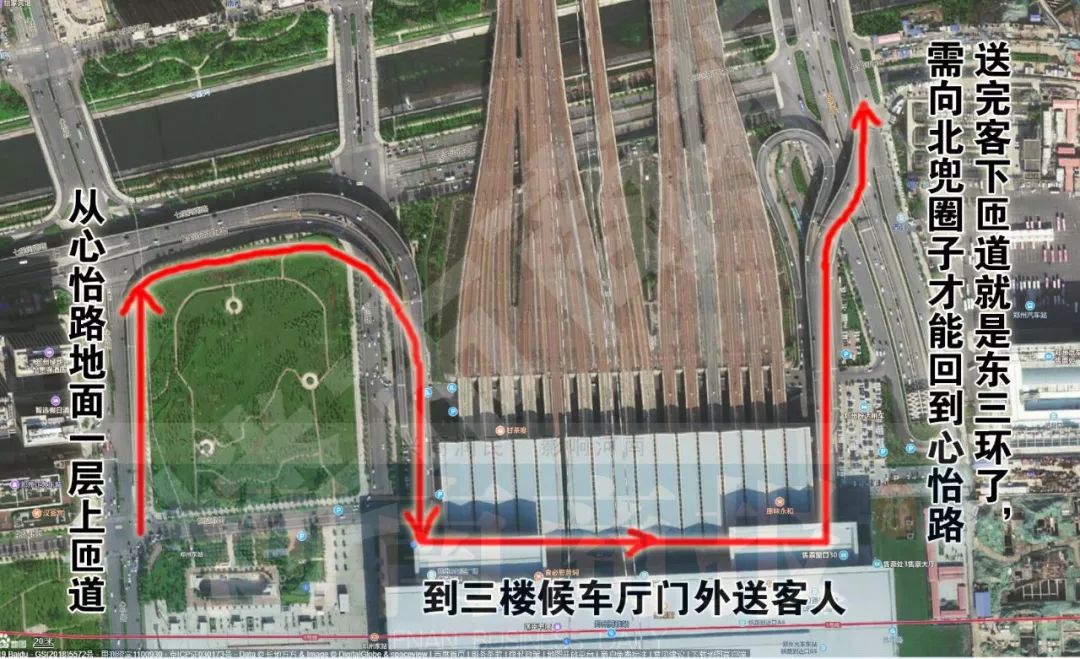 以郑州东站为例,周围的陇海高架、东三环高架没有匝道直通三层候车厅,您需要先从陇海高架下至东风南路上,经过几个红绿灯,再上匝道把车开到候车厅门口送人。