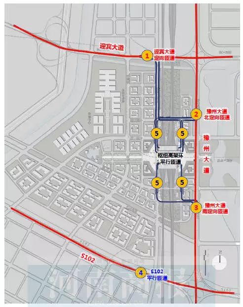 利用上下桥匝道及枢纽高架环匝道系统,南站可以与周边迎宾大道、豫州大道、金陵大道之间快速互联互通。