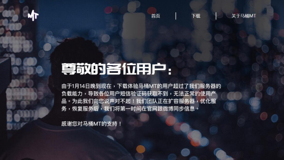 不过,马桶MT不仅还未正式上线分享链接已被微信禁止访问,短信无法通过腾讯大王卡发送等情况,而且上线不久无论是安卓还是iOS马桶MT处于无法被找到,通过官方网站无法搜到马桶MT下载地址,只留下官方发布公告称:由于11月14日晚到现在,下载体验马桶MT的用户超过了服务器的负载能力,导致各位用户短信验证码获取不到,刷新不了内容,无法正常使用产品。团队正在扩容服务器,优化服务,恢复服务后,将第一时间再官网公布。