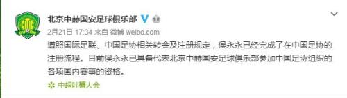 最终,随着北京国安在21日晚的一纸官宣,昔日挪威足球的希望之星侯永永,终于完成在中国足协的注册流程。也就是说,他已经具备代表北京国安参加国内赛事的资格,包括将于23日进行的超级杯。