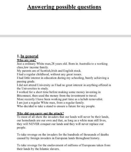 在“自述书”中,他说自己生于澳大利亚,现年28岁,他认为大量外来移民让“白人种族灭绝”,发起这次袭击是要让侵入者知道,“我们的领土永远不是他们的,我们必须保证自己人的生存,以及白人孩子的未来。”