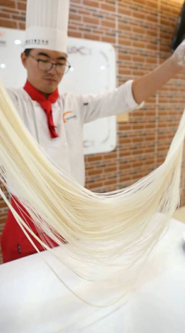 "要拉出又细又长的面条非常不容易,手艺要到位,更重要的是面要够筋。"张桀轩告诉记者,拉面一般都要用高筋粉,就是蛋白质含量在20%以上的面粉,里面必须加一些白糖,白糖的黏度比较大,可以增加拉面的韧性,让面细而不断。想要达到瞬间点燃的效果,面一定要达到和头发丝一样细的程度,可以穿过缝衣针的针眼。