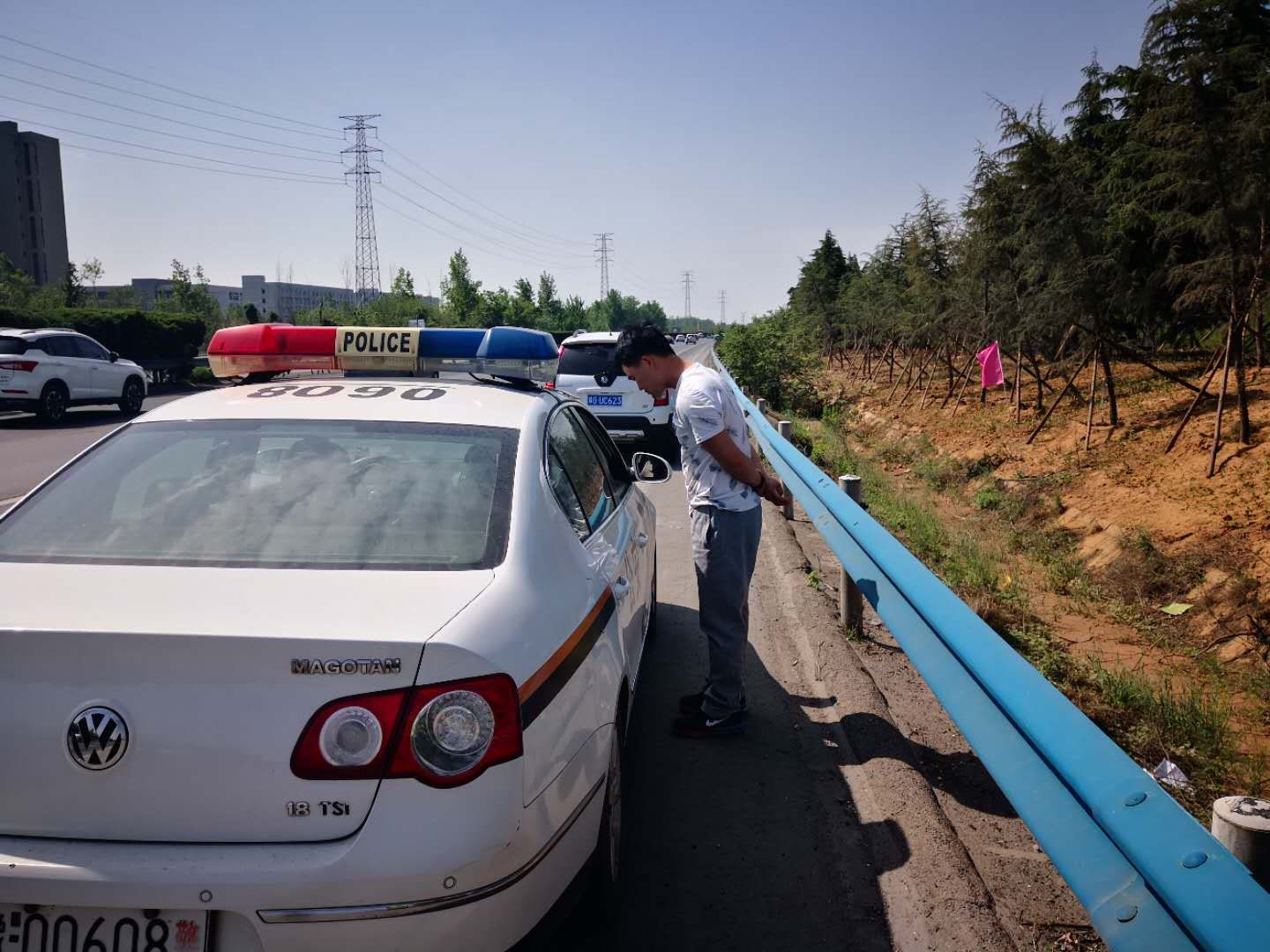 2019年5月2日上午9时50分许,河南高速交警总队二支队民警刘建伟、李青驾驶警车由北向南巡逻至京港澳高速公路679公里(郑州市航空港路段),看见一辆豫GUC***白色小客车闪着双闪灯停在应急车道内,车后150米未设警示标志,刘建伟负责警戒,李青上前询问情况,初步观察车内坐有三人,两个大人一个孩子,像是一家三口出来旅游的。民警查看了驾驶员王某的驾驶证、行驶证,问道:“为什么停车?”王某说:“正开着车呢,手机响了,我知道开车不能接电话,于是就把车停在应急车道内再接。”民警告诉王某:“你有安全意识很好,但是停车接电话构成了随意停车违法行为,减速、停车、再起步加速并入行车道的过程,安全隐患更大。”民警对王某开具了简易程序处罚决定书,王某对处罚没有异议。