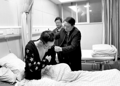 新乡市政府副市长,公安局党委书记、局长杨俊杰探望受伤民警朱喆。