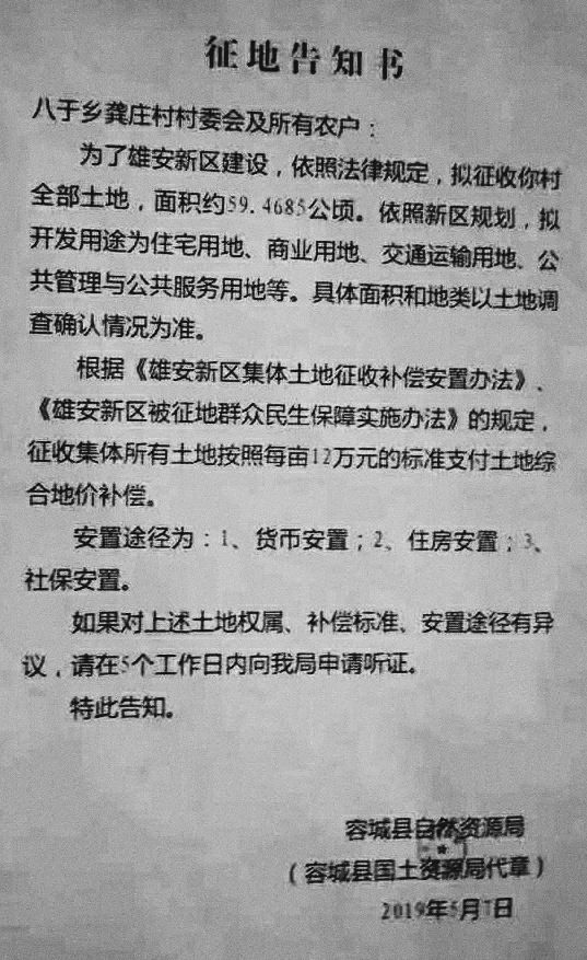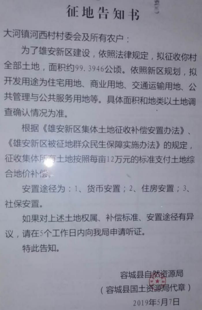 5月7日,雄安新区征迁安置工作正式启动实施。记者获悉的两张征地告知书图片显示,第一批征地约159亩,每亩12万补偿。
