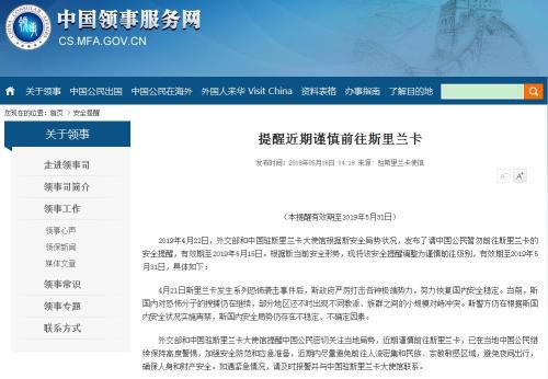 中新网5月16日电 据中国领事服务网消息,2019年4月22日,外交部和中国驻斯里兰卡大使馆根据斯安全局势状况,发布了请中国公民暂勿前往斯里兰卡的安全提醒,有效期至2019年5月15日。根据斯当前安全形势,现将该安全提醒调整为谨慎前往级别,有效期至2019年5月31日,具体如下: