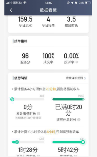 其中,短时策略要求,所有滴滴网约车驾驶员服务时长(从司机接到订单到订单结束计费的全部时长)累计满4小时且之间一次性休息时间不足20分钟的,需要下线休息20分钟才能再次上线接单。