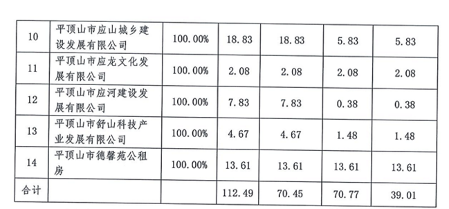 公告称,将舞钢市水利局持有的舞钢市利民水资源开发建设服务公司100%国有股权、舞钢市财政局持有的舞钢市汇济资产经营有限公司100%国有股权、舞钢市浩源水利设施建设有限公司49%国有股权、舞钢市启航农业发展有限公司49%国有股权、舞钢市龙凤湖旅游开发投资有限公司20%国有股权、舞钢市技改办持有的舞钢市泽源发展投资有限公司49%国有股权、舞钢市园林局持有的舞钢市园林绿化公司100%国有股权、舞钢市住建局持有的舞钢市公交公司100%国有股权、舞钢市房地产开发公司10%国有股权,合计总资产23亿元、净资产19.53亿元,无偿置入平发集团子公司舞钢市城乡开发建设投资有限公司;