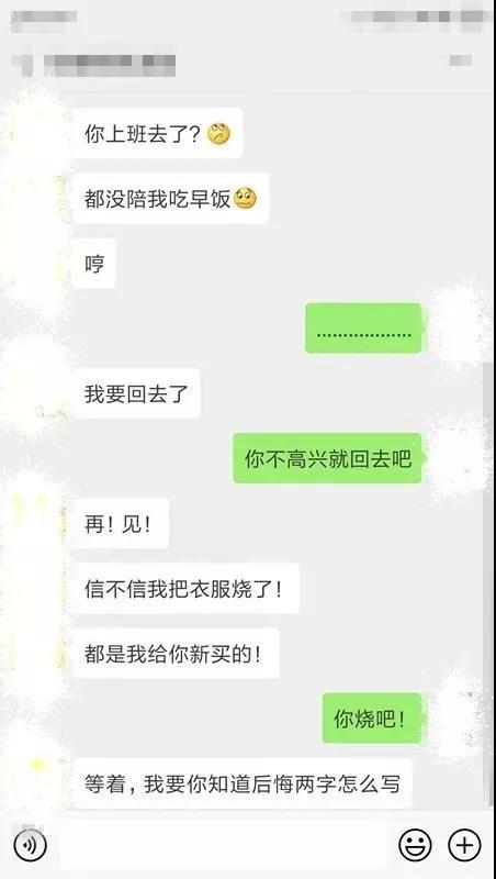 齐某一怒之下收拾衣服准备走人,突然看到衣架上买给男友的新衣服,她发信息过去:“信不信我把你衣服烧了!”
