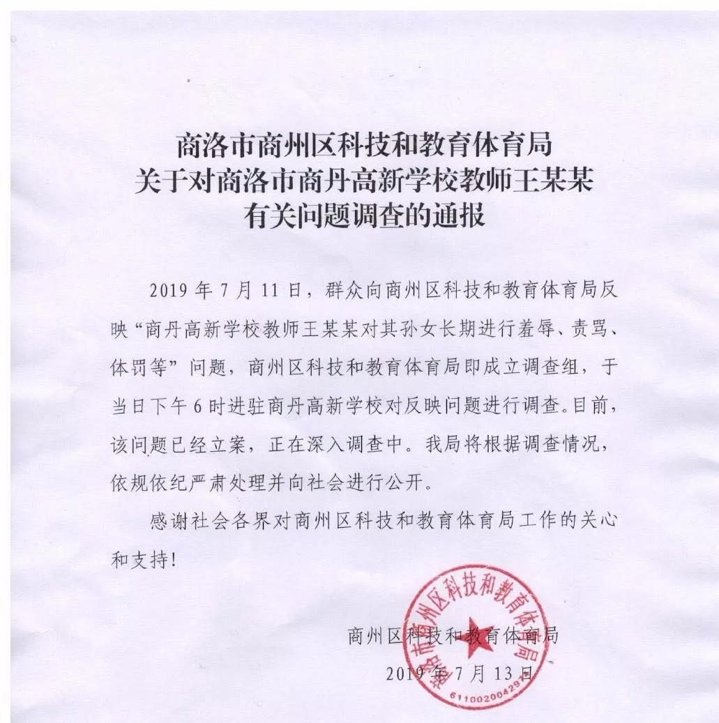 13日晚,商州区科技与教育体育局就该事件发布《关于对商洛市商丹高新学校教师王某某有关问题调查的通报》,其中提到:7月11日,已收到群众向局里反映该情况,并于当日下午6时进驻商丹高新学校对反映问题进行调查。目前该问题已经立案,正在深入调查中。我局将根据调查情况,依规依纪严肃处理并向社会进行公开。