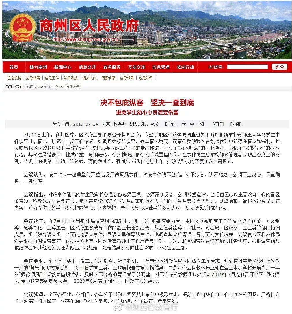 14日,商州区人民政府网也就此事发布通报《决不包庇纵容 坚决一查到底》。通报称:经调查组初步调查,辱骂情况属实。区政府认为,该事件是一起典型的严重违反师德师风事件。对该事件决不包庇,决不纵容,决不姑息,必须下定决心,深查彻查,一查到底。