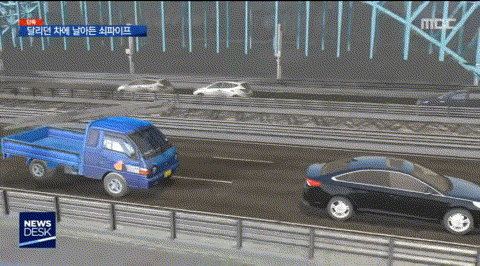 据韩国MBC新闻15日报道,12日上午,一名男子驾驶黑色轿车在汉江铜雀大桥行驶,后面一辆卡车因为太晚注意到前方车辆而紧急刹车。