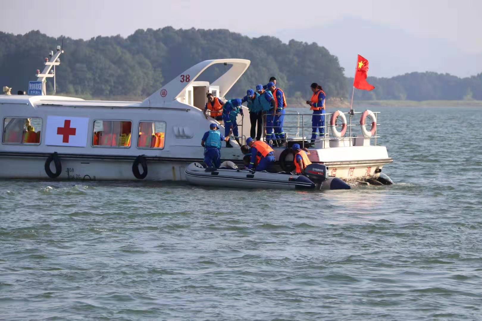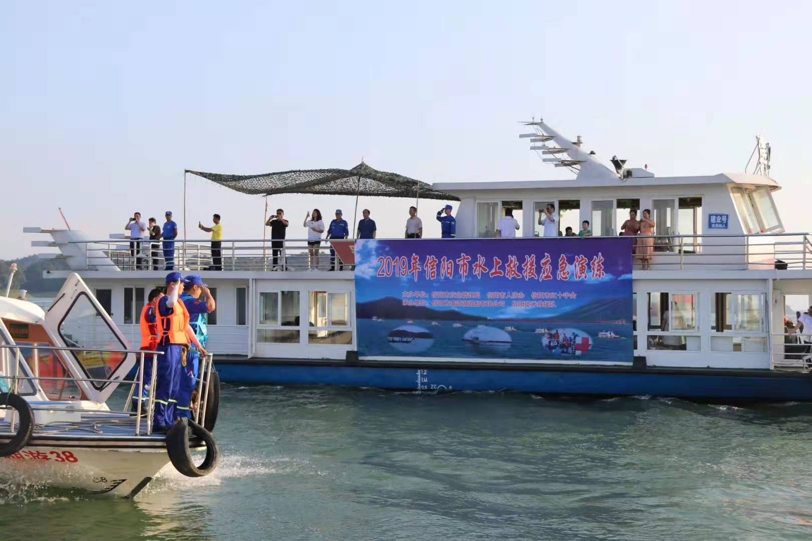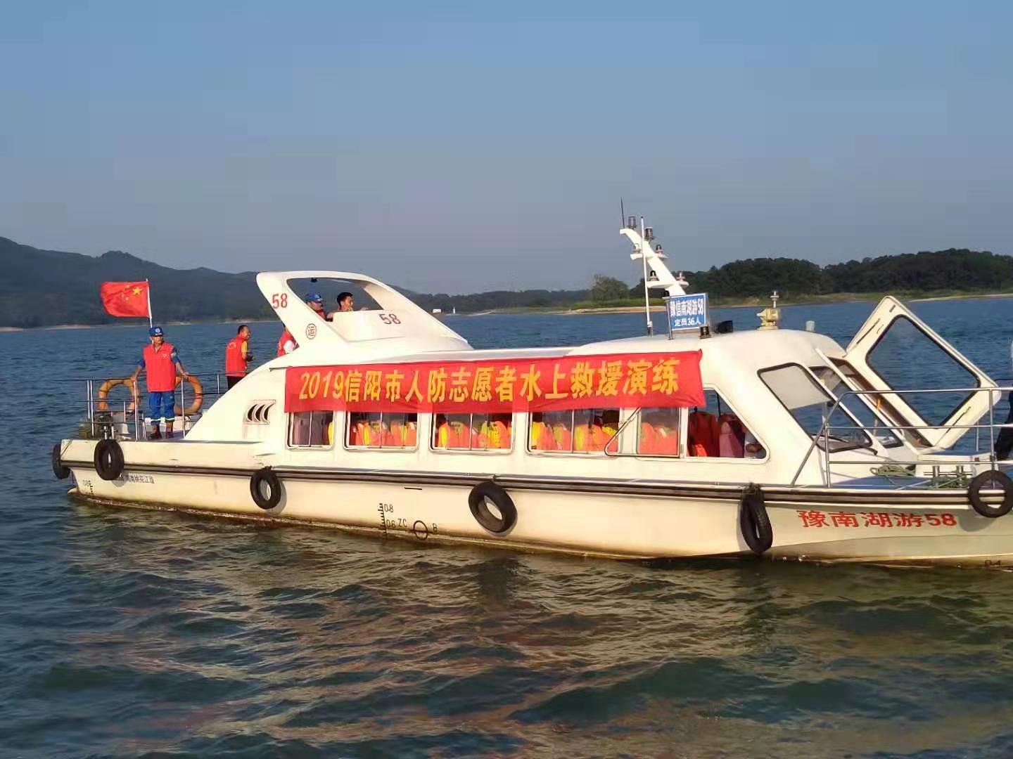 大河网讯 (记者 宋向乐)随着气温持续居高不下,溺水事故时有发生。大河网记者从省人防办获悉,7月28日,信阳市人防办联合信阳市应急管理局、信阳市红十字会和信阳市南湾湖游船有限公司组织人防志愿者队伍信阳蓝天救援队在南湾湖开展了2019年信阳市水上救援应急演练。