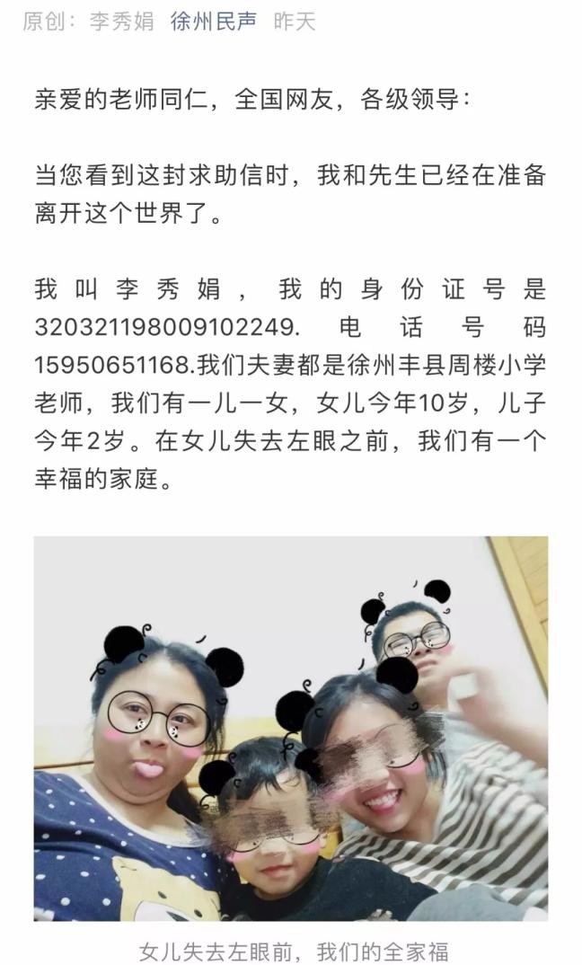8月4日,江苏徐州丰县周楼小学教师李秀娟发布求助信:“我和先生已经在准备离开这个世界了。”