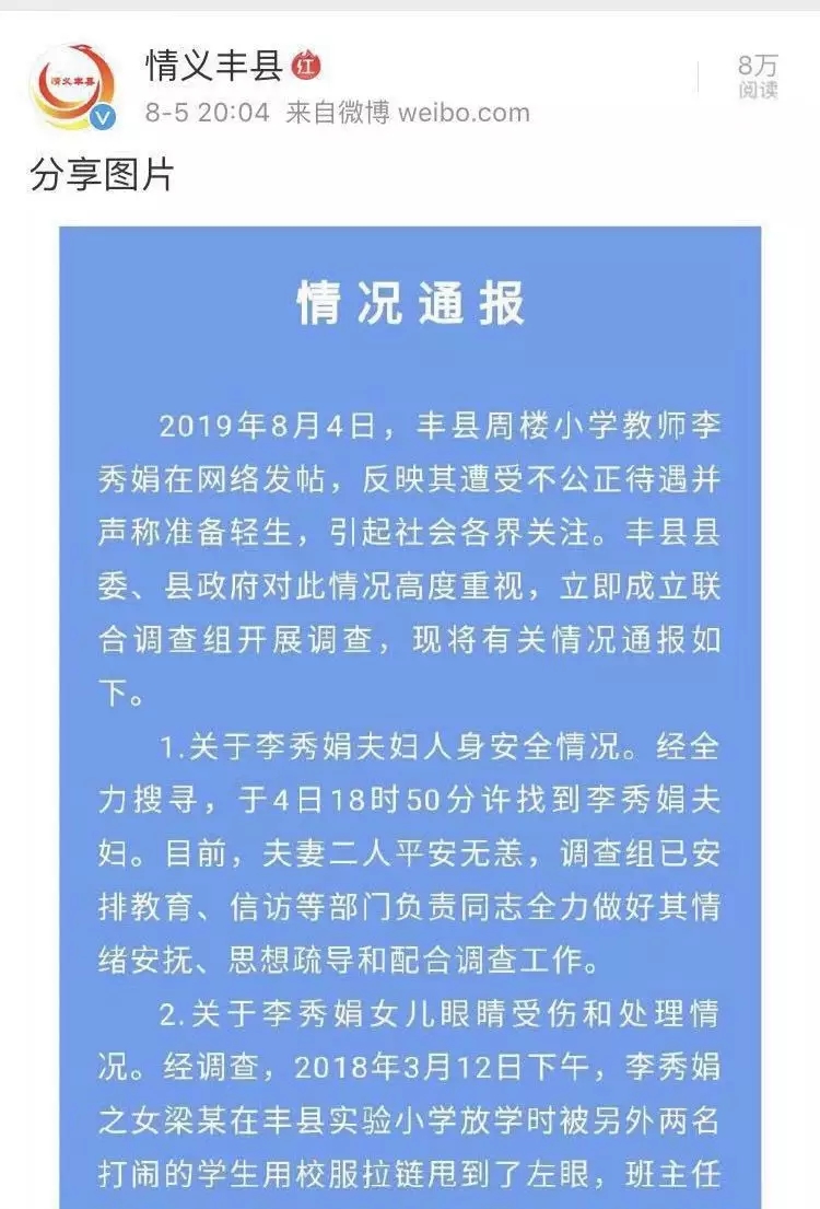 2019年8月4日,丰县周楼小学教师李秀娟在网络发帖,反映其遭受不公正待遇并声称准备轻生,引起社会各界关注。丰县县委、县政府对此情况高度重视,立即成立联合调查组开展调查,现将有关情况通报如下。