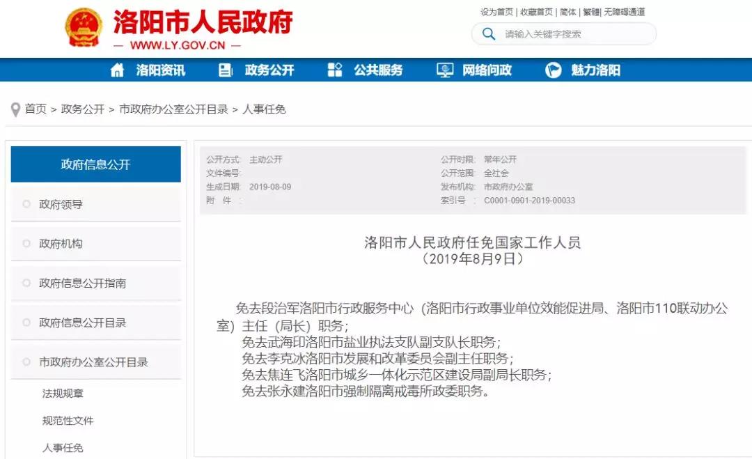免去段治军洛阳市行政服务中心(洛阳市行政事业单位效能促进局、洛阳市110联动办公室)主任(局长)职务;