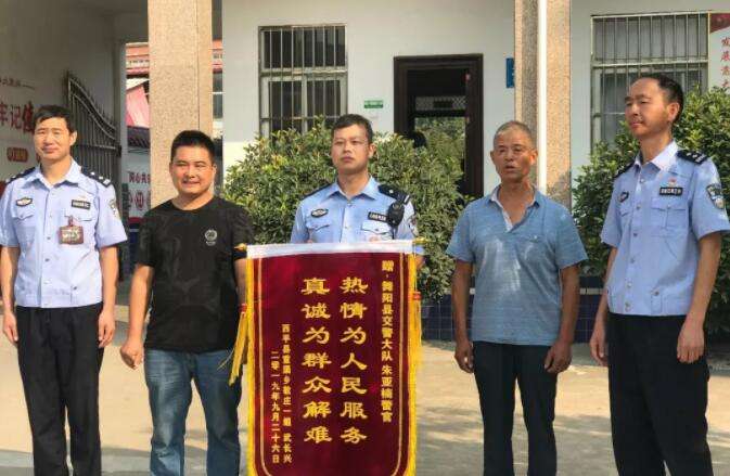 10月1日上午,驻马店男子武长兴在朋友的陪伴下,来到漯河舞阳县交警大队,将一面锦旗交到该大队民警朱亚楠手中。
