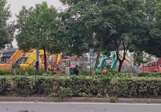 突破重重警戒线,早晨7点多,记者在事发地看到,现场锡港路上跨桥桥面侧翻严重,桥梁高约5米左右,西向东两条车道,约70米长的桥面向北侧翻。有多辆挖掘机和钩机等大型机器正在现场作业,对桥面进行破拆,发出“咣咣”的声响。